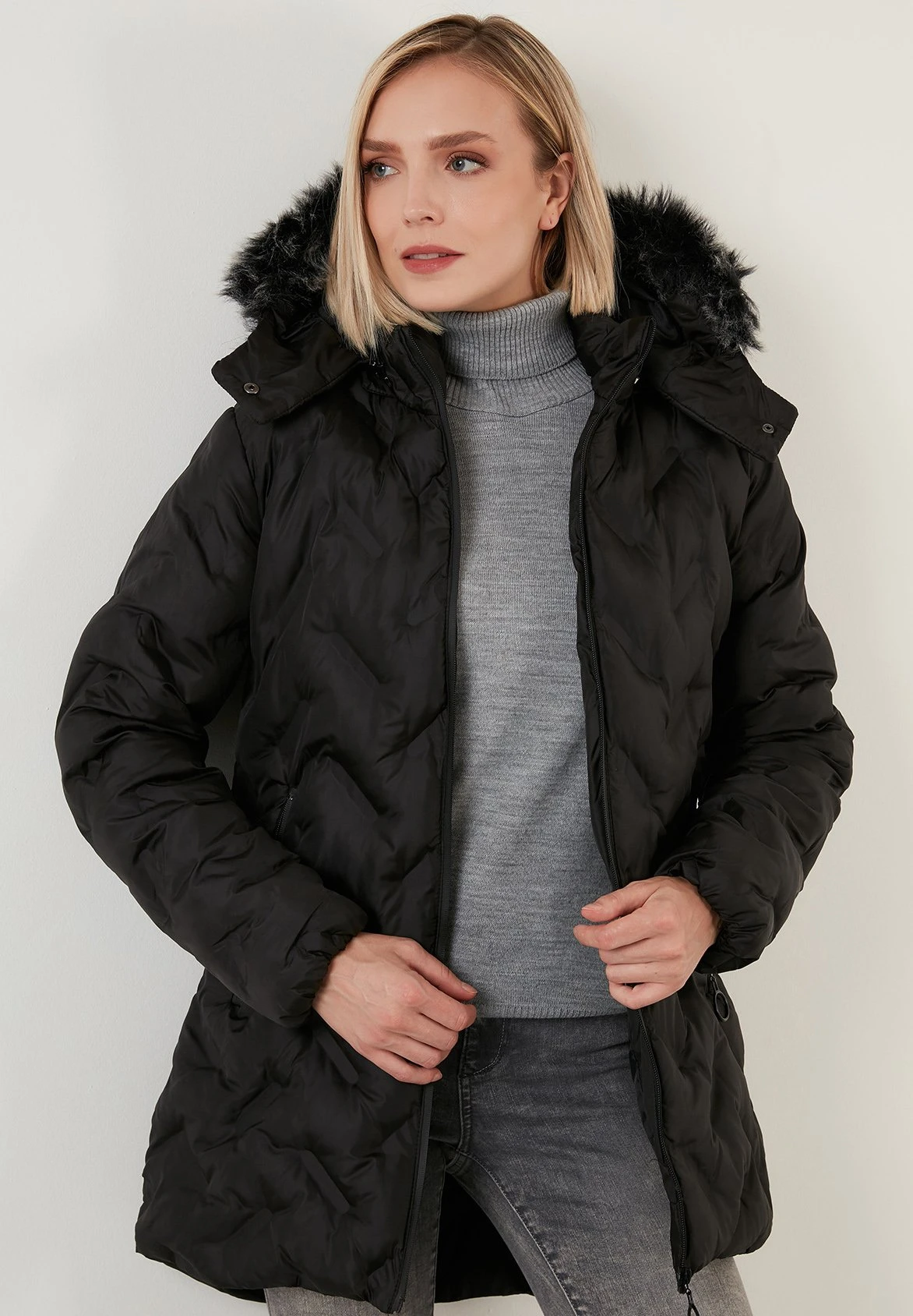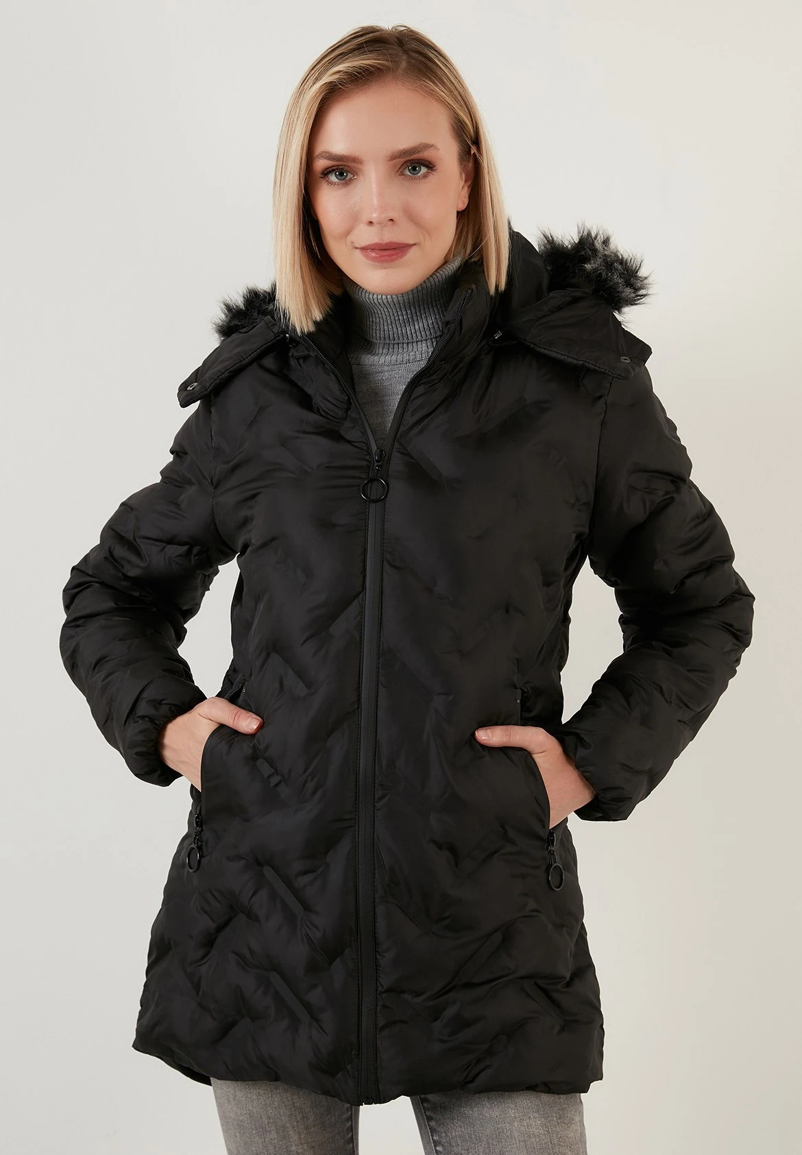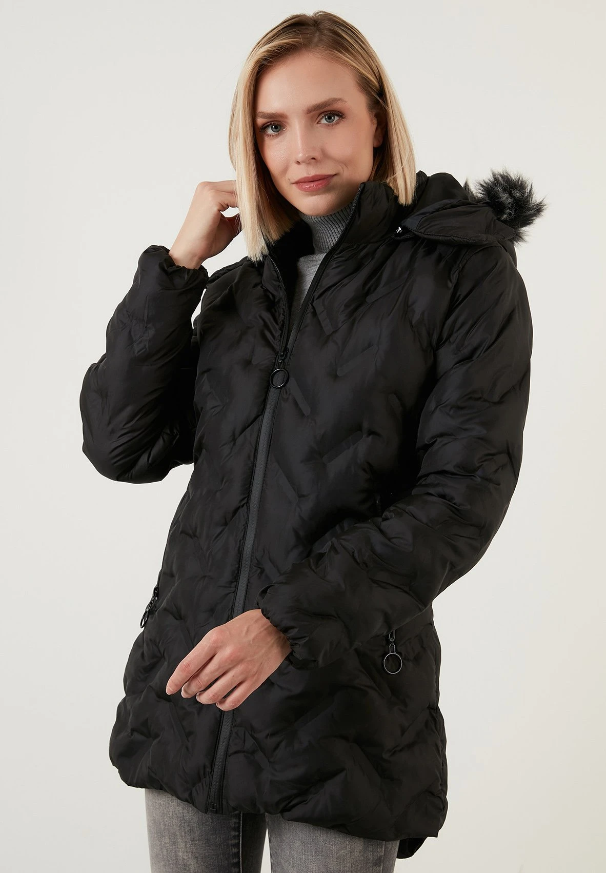 | Details capuchon | Gevoerd, afneembare imitatiebontkraag |