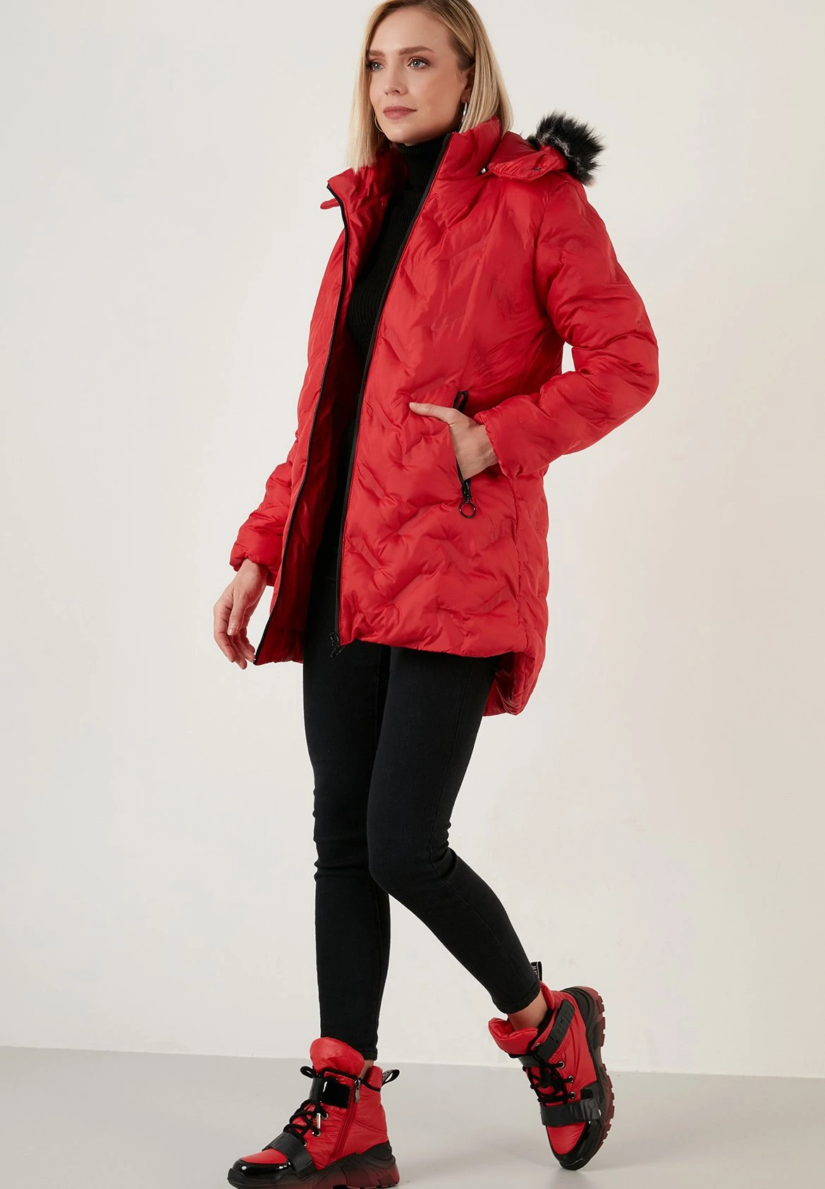 | Details capuchon | Gevoerd, afneembare imitatiebontkraag |